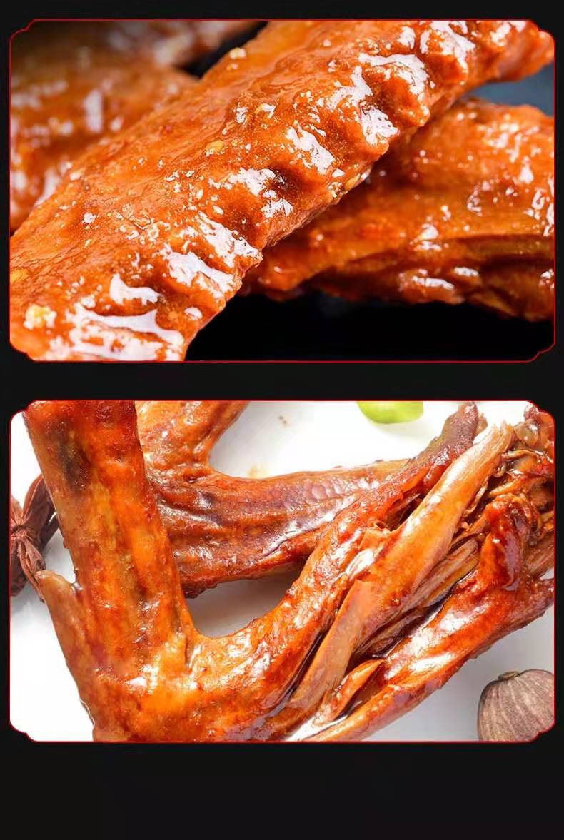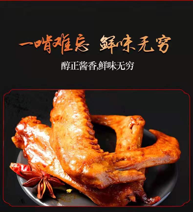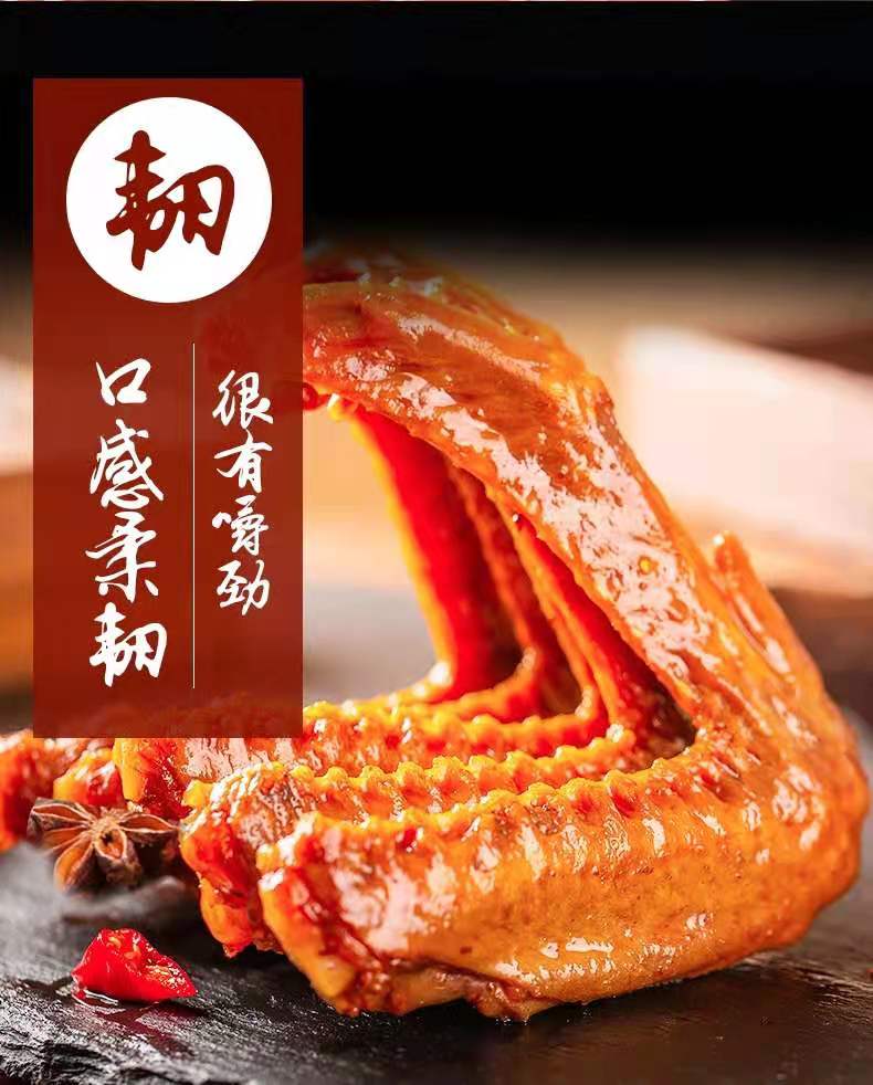產品名稱:鴨翅 凈重:40g/包 食用方法:開袋即食 儲存條件:陰涼,通風干燥處 配料:鴨翅,食用鹽,味精,植物油等